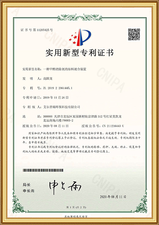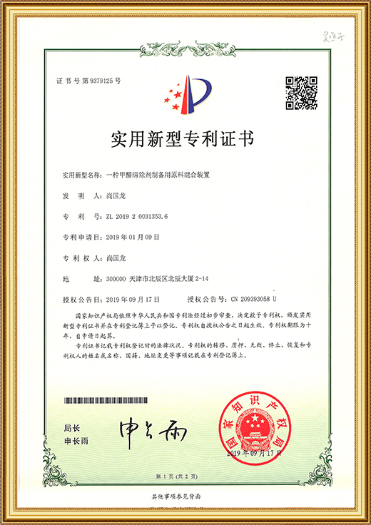 實(shí)用新型專利證書(shū)(一種甲醛清除劑的原料混合