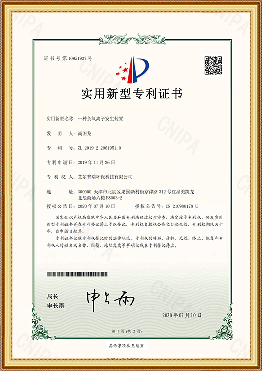 實(shí)用新型專利證書(shū)(一種負(fù)氧離子發(fā)生裝置)