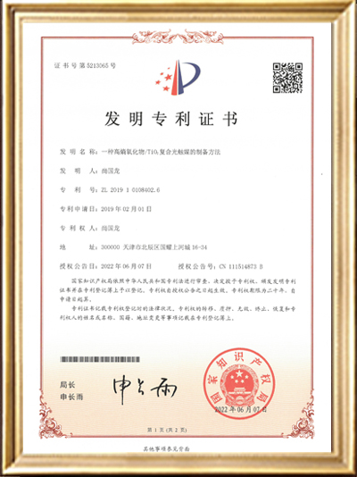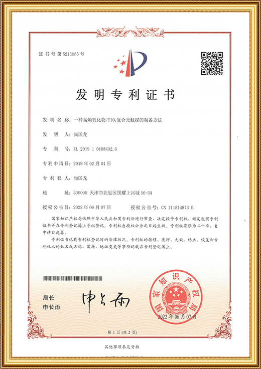 發(fā)明專利證書(shū)證書(shū)(一種高稿氧化物/Ti02復(fù)合光觸